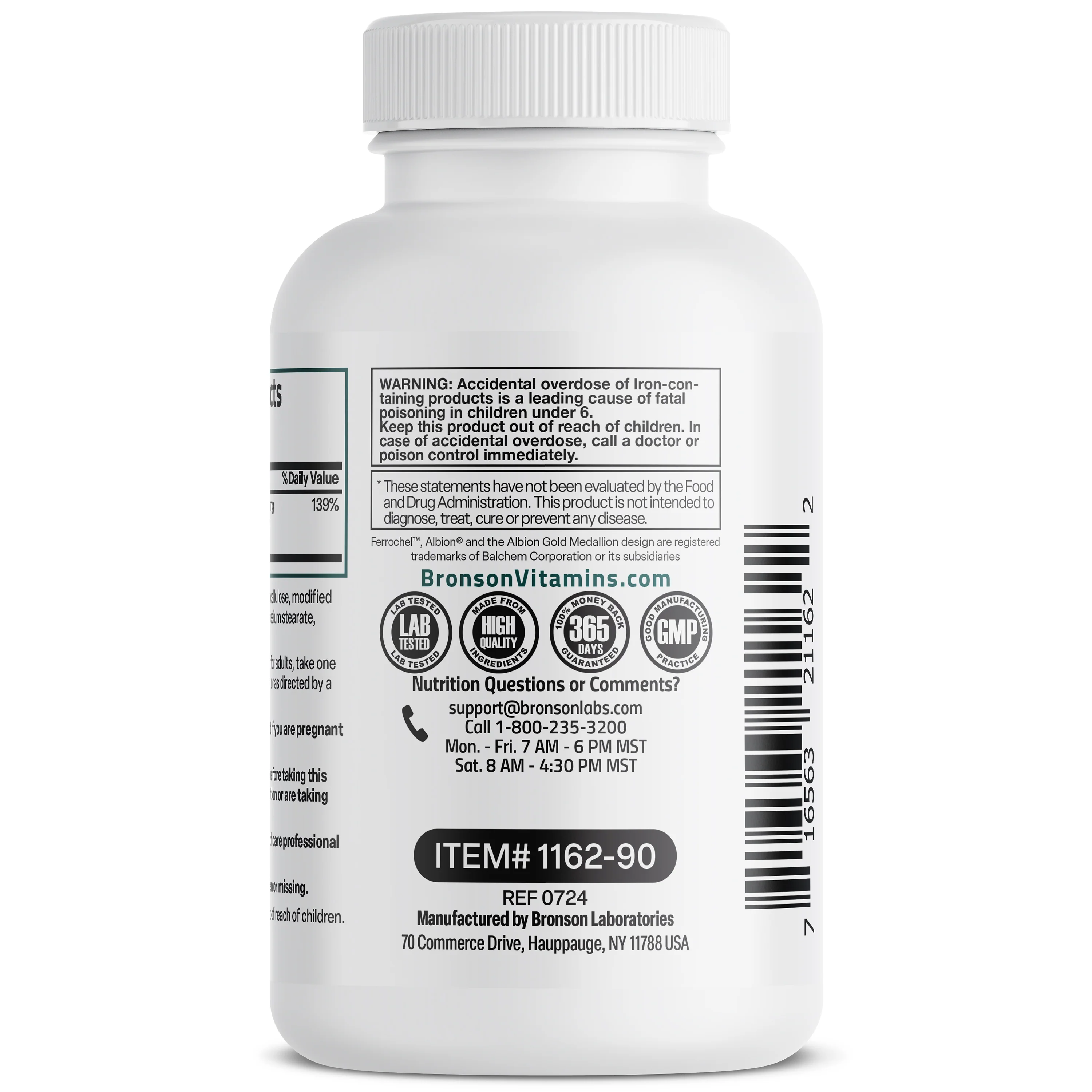 Bronson’s Iron Bisglycinate provides 25 mg of non-constipating Iron per vegetarian capsule to support healthy red blood cell production, energy levels, blood circulation, and more.* By supplying 25 mg of Iron per capsule, Bronson’s Iron Bisglycinate helps to combat potential Iron deficiency by improving nutritional iron levels in the body. Each capsule provides Iron as Ferrous Bisglycinate Chelate, which has been shown to deliver a highly absorbable form of this key mineral. Laboratory tested and free of GMOs, Gluten and Soy, Iron Bisglycinate 25 mg is in-house tested and carefully manufactured by trained professionals in our state-of-the-art facility that is located in Hauppauge, New York